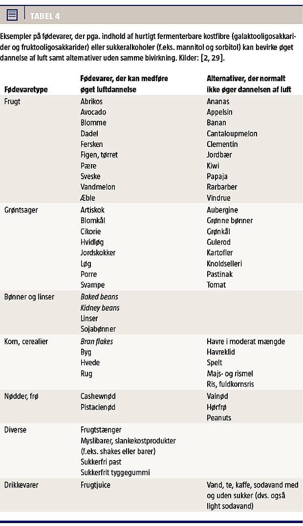 (Tabel 4). I stedet anbefales gulerødder, grønne bønner, knoldsellerier, tomater, kartofler, bananer, appelsiner og bær [2, 29]. Øget væskeindtag har næppe nogen virkning alene, men øger effekten af fibrene. Derfor tilrådes det at drikke to liter væske (overvejende vand) dagligt. Det daglige fysiske aktivitetsniveau tilrådes øget med en halv times daglig motion af let til moderat intensitet. God defækationspraksis indbefatter også regelmæssighed, undgåelse af kraftig pressen og ændring af siddestilling i retning af hugsiddende.