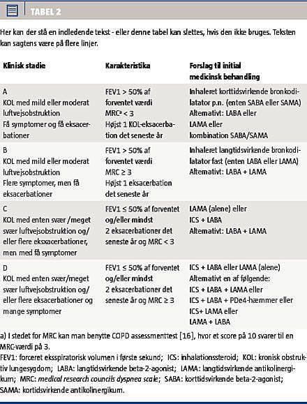 Den største forskel mellem den nyeste opdatering af GOLD-retningslinjerne og de tidligere udgaver er, at man ud over spirometri nu tager udgangspunkt i patientens daglige symptomer og i patientens risiko for at få en eksacerbation, og således foretager en mere patientorienteret risikostratificering [8]. Til gradering af symptomerne kan anvendes enten den kendte åndenødsskala medical research councils dyspnoea scale (MRC) eller den lidt mindre udbredte COPD assessment test [8, 15, 16]. Skæringspunktet på MRC-skalaen, hvor symptomerne defineres som værende betydende, svarer til score 3 (eller 2 på den såkaldte modific erede MRC-skala (mMRC)), hvilket svarer til, at patienten ikke kan følge med jævnaldrende i jævnt terræn på grund af åndenød. Ved eksacerbationer forstås pludselige forværringer i symptomerne, som er ud over den normale dag til dagvariation, og som fører til en behandlingsændring, hvilket i praksis betyder en antibiotikakur eller en prednisolonkur eller begge dele. Hyppigheden af eksacerbationer i det foregående år (højst en eller mindst to) definerer, om man er i lavrisikogruppen eller i højrisikogruppen for at få nye eksacerbationer [8, 17]. De tre parametre, FEV1, symptomer og eksacerbationer, definerer nu opdelingen af patienterne i de kliniske grupper A, B, C og D (Tabel 2). Det er vigtigt at lægge mærke til, at patienterne kan komme i gruppe C eller D (højrisikogrupperne) enten på grund af lav FEV1 eller på grund af hyppige eksacerbationer [8].
