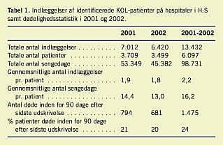 I Tabel 1 vises antallet af indlæggelser af patienter med diagnosen KOL, benyttelse af sengedage og antal døde inden for 90 dage efter sidste udskrivning. På årsbasis er det gennemsnitlige antal indlæggelser pr. patient lige under to, mens 62% af patienterne kun blev indlagt en gang pr. år, og resten blev indlagt to eller flere gange. Antallet af benyttede sengedage pr. år andrager ca. 14 dage (7,4 dage pr. indlæggelse). Omkring en femtedel af patienterne døde inden for 90 dage efter sidste udskrivning. I 2001 blev der året rundt i H:S benyttet 146 senge og i 2002 127 senge til patienter med KOL.