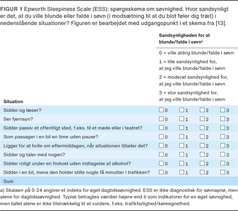 De mest anvendte screeningsværktøjer i Danmark er spørgeskemaerne Epworth Sleepiness Scale (ESS) og STOP-Bang. ESS giver en indikation om risikoen for søvnanfald (Figur 1), mens STOP-Bang anvendes til at estimere risikoen for søvnapnø [13, 14]. STOP-Bang er valideret på dansk, men det er endnu ikke tilfældet for ESS.