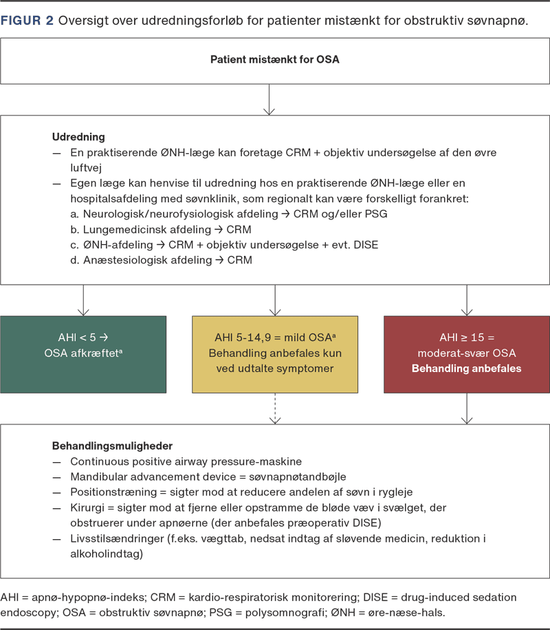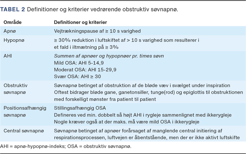 På baggrund af CRM beregnes et apnø-hypopnø-indeks (AHI) (Tabel 2). Baseret på dette inddeles OSA i en mild, moderat og svær grad. Sværhedsgraden af symptomer korrelerer ikke entydigt med sværhedsgraden af OSA [16].
