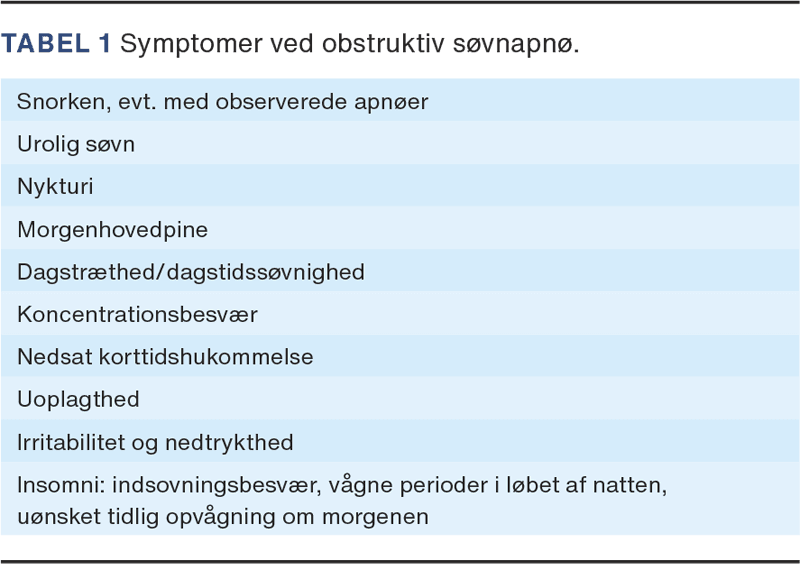 OSA er forbundet med urolig og afbrudt nattesøvn samt dagstidssymptomer, der alle kan bidrage til manglende overskud og nedsat livskvalitet (Tabel 1). Hos især kvinder er OSA associeret med udmattelse, depressive symptomer, insomni og hovedpine, og OSA overses oftere hos kvinder [9, 11]. Insomni kan forekomme ved OSA, men er også en selvstændig søvnforstyrrelse, der behandles i henhold til Sundhedsstyrelsens anbefalinger [12].