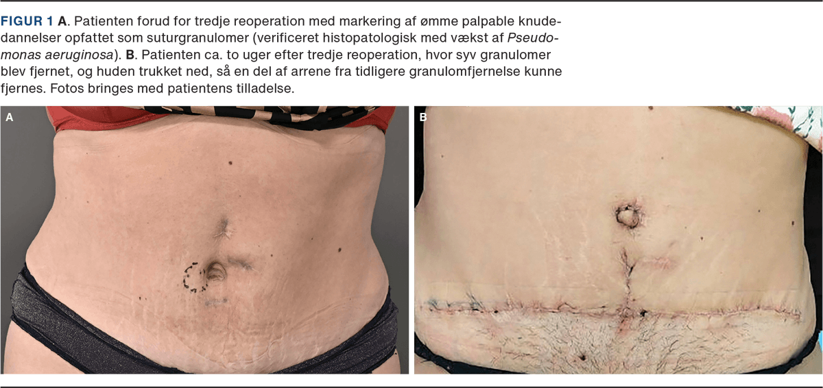 En 38-årig kvinde blev henvist til plastikkirurgisk afdeling grundet mistanke om suturgranulomer tre år efter en abdominalplastik med samtidig plication af RD udført med permanent sutur i privat regi (Ethibond; en flettet polyestersutur). Cirka hhv. et og to år efter primæroperationen fik patienten fjernet i alt tre suturgranulomer operativt i abdominalkirurgisk regi – begge gange med kliniske tegn på infektion. Suturgranulomerne medførte vedvarende smerter og ubehag, og da der opstod mistanke om yderligere granulomer, blev patienten henvist til plastikkirurgisk vurdering. Her fandtes klinisk tegn på tre nye suturgranulomer i midtlinjen i tæt relation til umbilicus. Fundene blev bekræftet ved en UL-skanning. Patienten blev opereret via cicatricen fra abdominalplastikken. Abdominalhuden blev genløftet, og de palpable suturgranulomer blev excideret sammen med al synlig rest af den permanente sutur. I alt blev syv granulomer fjernet. Ved operationen blev der observeret pusdannelse i granulomerne, og der blev sendt væv til dyrkning og resistensbestemmelse (D+R), som viste vækst af Pseudomonas aeruginosa, sensitiv for ciprofloxacin (Figur 1). Patienten blev behandlet herefter og har ikke haft recidiv inden for 24 måneders opfølgning. Patienten angav dog telefonisk nytilkomne gener fra et lille område, hvilket kunne være foreneligt med et nyt granulom, endnu ikke verificeret, men ikke usandsynligt, da fjernelse af alt suturmaterialet blev skønnet for traumatisk. Patienten er ikke diagnosticeret med risikofaktorer for infektion som rygning, overvægt eller diabetes.
