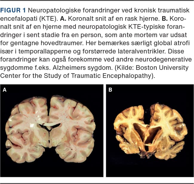 Kronisk traumatisk encefalopati (KTE) er i de seneste 10-15 år kommet i søgelyset bl.a. grundet populærkulturelle fremstillinger og opmærksomhed på tilstanden hos pensionerede professionelle, amerikanske fodboldspillere [1]. KTE blev allerede beskrevet i 1920’erne som »punch drunk« eller »dementia pugilistica« (latin, pugil = bokser), der, som navnet antyder, først blev beskrevet hos boksere [2]. KTE dækker over en demenslignende tilstand, som formodes at være forårsaget af den kumulerede effekt af multiple (subkliniske/mindre alvorlige) slag mod hovedet og er således ikke begrænset til boksere. Nylige undersøgelser tyder på, at KTE hos nogle patienter er en progredierende, neurodegenerativ sygdom, som forværres selv efter, at patienterne ikke længere udsættes for hovedtraumer [3-8]. Viden om KTE kommer primært fra mindre studier, enkelte kasuistikker, case-serier og enkelte større studier med en overvægt af retrospektive post mortem-studier.
