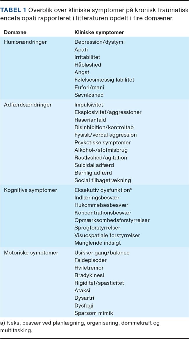 KTE ses typisk flere år efter eksponering for gentagne slag mod hovedet og adskiller sig herved især fra hjernerystelse og det postkommotionelle syndrom, hvor symptomerne ses umiddelbart efter et enkelt hovedtraume [10]. Desuden er postkommotionelt syndrom karakteriseret ved et godartet og typisk selvbegrænsende forløb, og langt de fleste er symptomfrie tre måneder efter hovedtraumet [11]. Det er uvist, om der findes en nedre tærskel for antallet, intensiteten eller varigheden af udsættelse for hovedtraumer for udvikling af KTE. Der findes ingen validerede kliniske diagnostiske kriterier for KTE. De kliniske symptomer, der er beskrevet i litteraturen, er ofte indhentet retrospektivt fra pårørende efter post mortem-undersøgelser og indebærer en risiko for informationsbias og selektionsbias [6]. I flere studier er der beskrevet progredierende symptomer over tid hos > 90% [10]. Symptomer ved KTE kan opdeles i fire overordnede domæner, som fremgår af Tabel 1: 1) humørændringer, 2) adfærdsændringer, 3) kognitionssvækkelse og 4) motoriske symptomer [7, 10]. Denne spændvidde i symptomer afspejler formentligt, at hele hjernen kan påvirkes, afhængigt af den enkelte patients eksponering og forekomst af andre komorbiditeter.