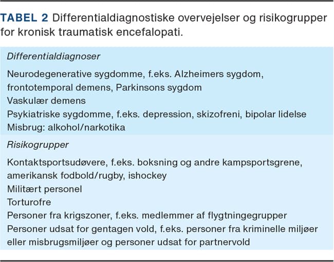I modsætning til øvrige traumatiske hjerneskader, der typisk opstår efter et enkelt og voldsomt traume mod hovedet, udvikler KTE sig mere snigende. Denne mere atypiske præsentation og udvikling indebærer en risiko for, at patienterne kan leve med tilstanden og betydelig invaliditet uden at modtage hjælp i form af f.eks. hjerneskaderehabilitering eller en social indsats [12]. Den atypiske præsentation kan også medføre, at patienterne mistænkes for at have funktionelle lidelser eller mødes med mistro. Hos amatørboksere og ishockeyspillere, der har haft hjernerystelse, er neurofilament light chain (NfL)-koncentrationen (markør for neurodegeneration) i cerebrospinalvæsken (CSV) forhøjet i flere måneder efter hovedtraumet [13, 14]. Repetitive nik til en læderfodbold medfører derimod ikke forhøjet NfL i CSV [15]. Dette nævnes med forbehold for, at det blev testet med kontrollerede hovedstød ved træningssessioner og således ikke i kampsituationer, hvor der kan formodes at ske mere ukontrollerede hovedstød, der medfører acceleration af hovedet, som det f.eks. ses ved boksning [15]. Der er enighed om, at gentagne slag mod hovedet er den væsentligste risikofaktor for at udvikle KTE, men i enkelte casestudier har man fundet KTE-patologi hos personer uden kendte hovedtraumer [16]. Desuden udvikles der ikke KTE hos alle personer med en historik med hovedtraumer, hvorfor andre faktorer også må spille ind, om end disse endnu er uafklarede [3]. Særligt udsatte risikogrupper fremgår af Tabel 2.