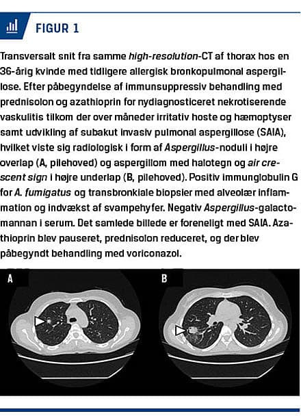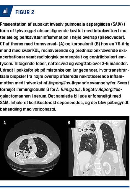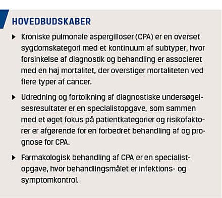 Kroniske pulmonale aspergilloser (CPA) er en overset og underdiagnosticeret sygdomskategori [1, 2]. Der foreligger ikke konsistente epidemiologiske data for CPA, men det estimeres, at der på verdensplan er mere end 3.000.000 afficerede personer [3], og at tilstanden forårsager mere end 450.000 dødsfald pr. år [4]. I et nyere dansk studie har man på baggrund af registerdata opgjort incidensraten og prævalensen af CPA i Danmark til hhv. 4,8/100.000 personår og 270/år [5]. Mortalitetsraten i Danmark er endnu ukendt. Den kliniske og radiologiske præsentation af CPA er sjældent åbenlys, idet CPA oftest optræder som et kontinuum med overlappende syndromer, hvor en subtype kan transformere sig til en anden. CPA er således en kompleks og udfordrende diagnose, der kræver flere tilstedeværende kriterier for at være opfyldt. Da CPA samtidig optræder med snigende symptomer, der kan overlappe med patientens eksisterende lungesygdom, overses CPA ofte med fatale konsekvenser til følge, idet CPA ubehandlet kan føre til invasiv sygdom eller lungefibrose med en femårsmortalitet på op til 80% [2, 6].