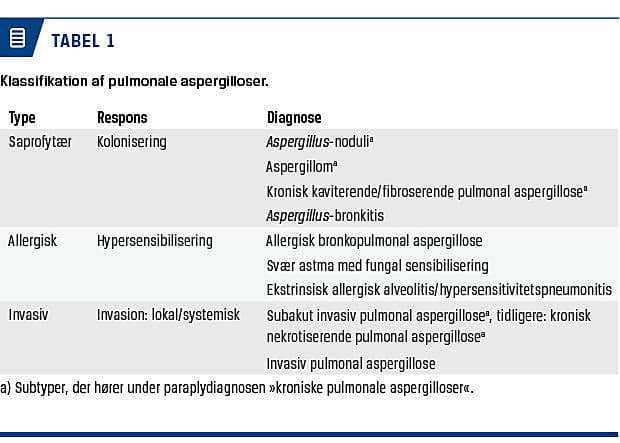 Pulmonale aspergilloser (PA) er en samlet betegnelse for de forskellige aspergillusrelaterede lungesygdomme, hvor udvikling af klinisk sygdom afhænger af værtens immunrespons [3, 7]. Almindeligvis vil immunkompetente personers innate immunforsvar (primært alveolære makrofager og neutrofile granulocytter) eliminere inhalerede svampesporer og forhindre udvikling af PA. Et ændret sammenspil mellem makrofager og neutrofile granulocytter, eksempelvis forårsaget af strukturelle lungedefekter og/eller brug af inhalationssteroid eller lavdosis systemisk steroid, må derfor formodes at disponere til udviklingen af PA hos ellers immunkompetente personer. Udvikling af en given PA-subtype vil dermed være forskellig hos patienter med et hyperreagerende versus et delvist nedsat