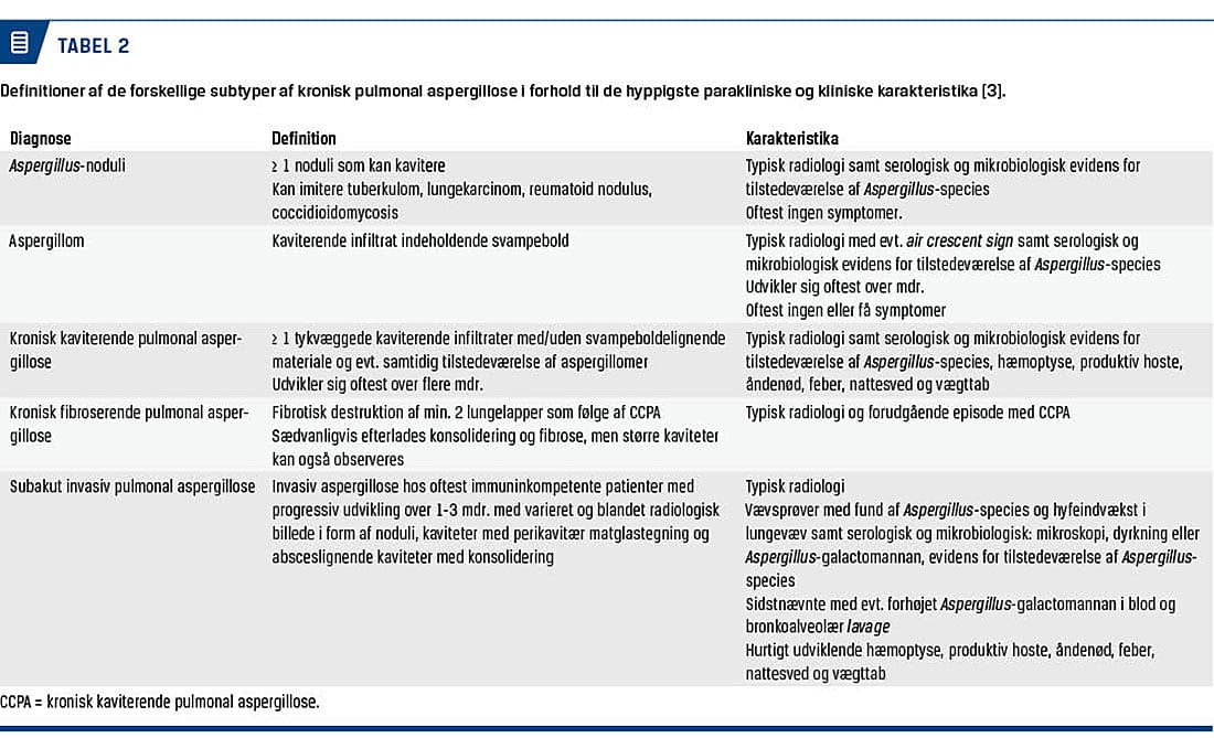 CPA er en paraplydiagnose, der dækker over subtyperne Aspergillus-noduli, aspergillom, kronisk kaviterende PA (CCPA), kronisk fibroserende PA (CFPA) og subakut invasiv PA (SAIA). Tidligere har SAIA været benævnt semiinvasiv PA og kronisk nekrotiserende PA (CNPA), men inden for de senere år er terminologien ensrettet til betegnelserne i Tabel 1 [3]. Definitioner på de forskellige CPA-subtyper fremgår af Tabel 2 og radiologiske eksempler af (Figur 1, Figur 2 og Figur 3).