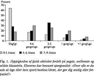 Hyppigheden af regelmæssig leg, sport, motion og idræt var afhængig af alderen; jo ældre eleverne var, des mindre fysisk udfoldelse havde de (KW: p < 0,0005) (Fig. 1 ).