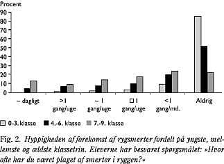 Ved spørgsmålet om de have haft rygsmerter inden for det seneste halve år svarede 29% positivt på dette i 0.-3. klasse, 63% i 4.-6. klasse og 87% i 7.-9. klasse (PC: p < 0,0005).