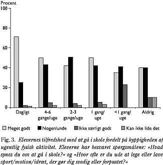 Der var ingen signifikant sammenhæng mellem motion og ondt i ryggen (KW: p = 0,399). Derimod var der en positiv sammenhæng mellem motion og »synes om skolen« (KW: p < 0,0005), idet ca. 96% af dem, der dagligt dyrkede motion, syntes meget godt eller nogenlunde godt om at gå i skole, hvorimod 80% af dem, der aldrig dyrkede motion, syntes meget godt eller nogenlunde om at gå i skole (Fig. 3 ).