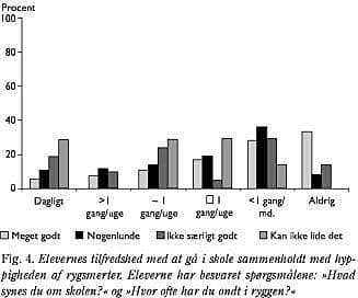 Resultater: Andelen af elever med rygsmerter steg med alderen, og hyppigheden af fysisk aktivitet faldt med alderen. Der var dog ingen sammenhæng mellem rygsmerter og fysisk aktivitet. Jo ældre eleverne var des større var andelen, som ikke syntes om at gå i skole. Flere af de elever, der ikke syntes om at gå i skole, havde rygsmerter, og flere af de elever, der syntes om at gå i skole, var fysisk aktive. Der var sammenhæng mellem forældrenes og elevernes rygsmerter.
