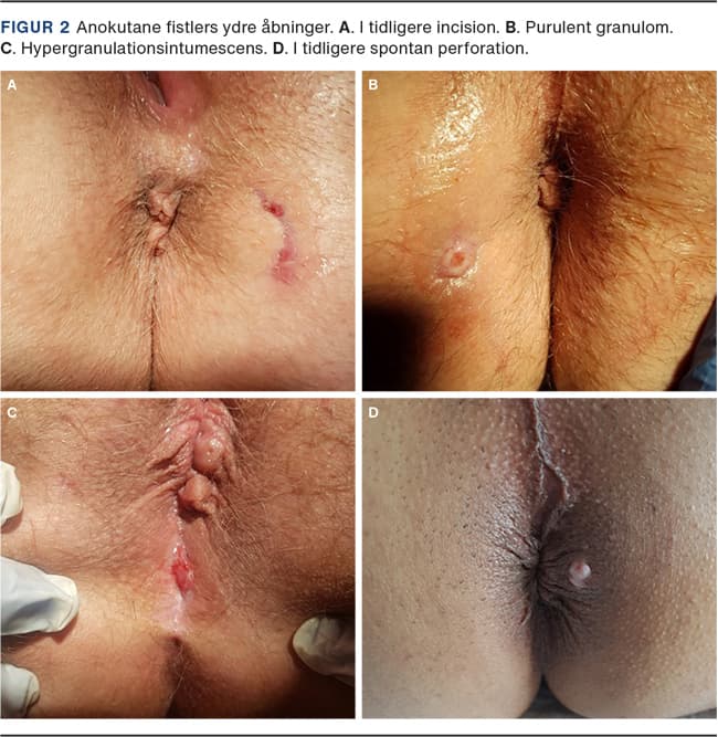 En ydre åbning tæt på anus indikerer en simpel fistel, mens en ydre åbning perifert for sphincterafgrænsningen indikerer en kompleks fistel [13]. Billeddiagnostik kræves for definitiv afklaring.