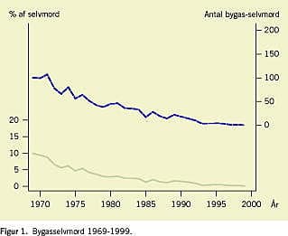 Ser man på udviklingen i selvmord med bygas, er der sket et nogenlunde jævnt fald fra omkring 100 selvmord om året i 1969 til ganske få om året i 1995-1999 [18]. Samtidig er den andel, som selvmord med bygas udgør af det samlede antal selvmord, faldet fra omkring 10% i 1969 til 0,3% i 1995-1999. Dvs. at faldet i antallet af selvmord med bygas ikke blot skyldes, at det totale antal selvmord er faldet, men nærmere, at selvmord med bygas næsten er ophørt som selvmordsmetode.