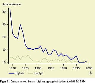 Konklusion: Antallet af bygasdødsfald er faldet meget siden 1969, hvilket kan forklares med faldet i antallet af kulilteholdige bygasinstallationer og forebyggende foranstaltninger. Ved overgangen til ikkekulilteholdig bygas i 2007 vil antallet af disse dødsfald formentlig falde yderligere, men man må dog fortsat være opmærksom på, at ufuldstændig forbrændning af ikkekulilteholdig gas også fremover vil kunne føre til kulilteforgiftninger.
