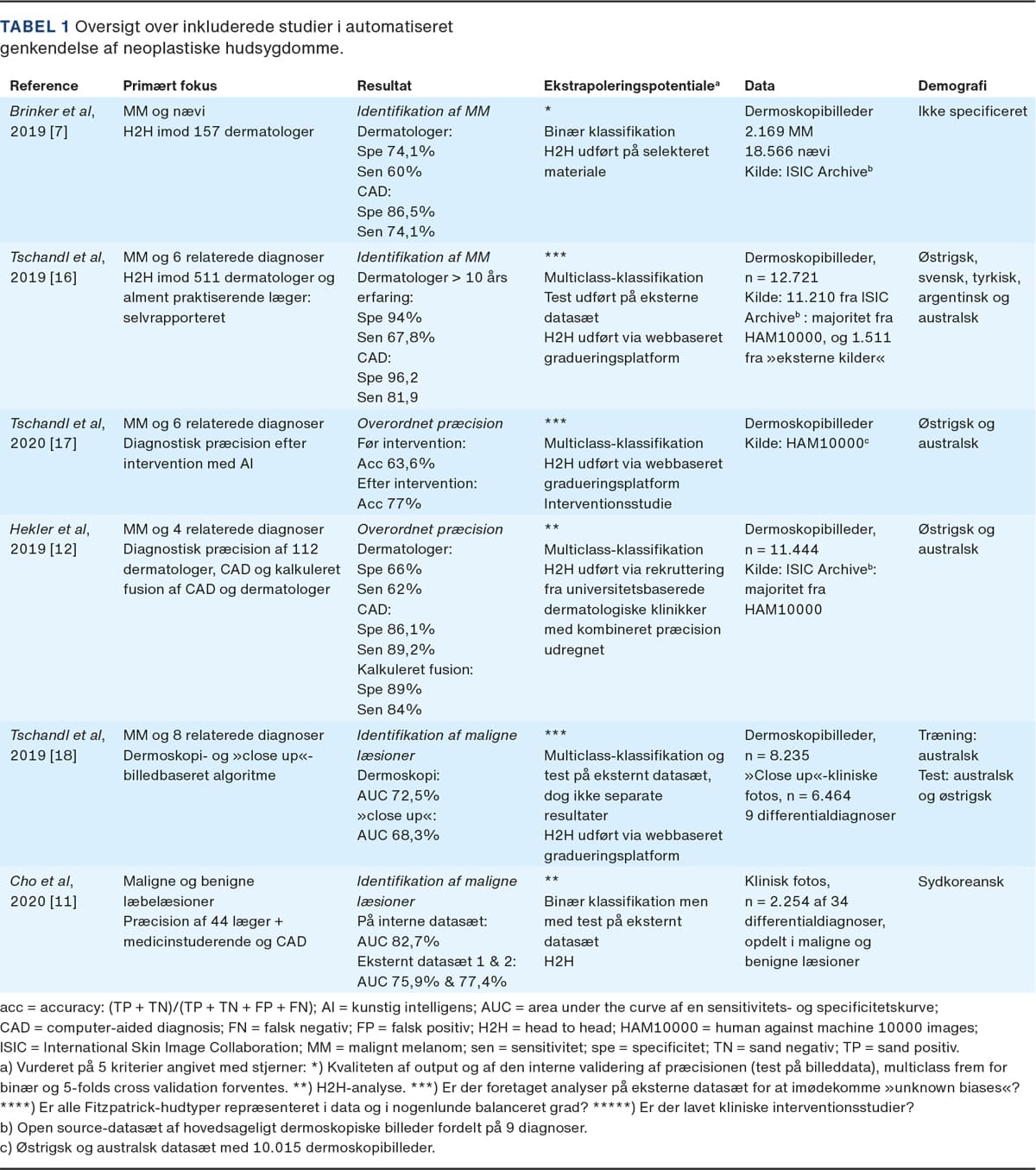 CAD-værktøjer trænet på dermoskopibilleder er dominerende i litteraturen (Tabel 1).