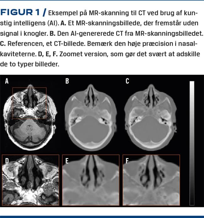 PET/MR er en nyere skanningsmodalitet med Nordens første installation på Rigshospitalet i 2011. PET/CT-skannere har høj diagnostisk sikkerhed, men PET/MR-skannerne kan være bedre til diagnostik af hjernesygdom m.m. Desværre skal man bruge CT til at korrigere PET-billederne for fotoners absorption i væv og knogler, og det kan man ikke med MR. Vi har derfor udviklet en AI-metode, som kan generere CT-lignende data fra MR-sekvenser til korrektion af PET-data og med en fejl i præcisionen på under 1% [17] (Figur 1). Systemet er implementeret i klinisk praksis til brug hos patienter med demens, så de undgår en ekstra CT, hvilket giver kortere undersøgelsestid og effektiviseringsgevinst med bedre patientkomfort og mindre stråledosis.