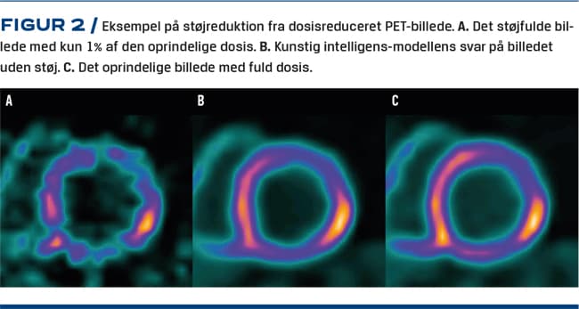 AI til reduktion af støj i billeddata betyder kortere skanningstid og lavere stråledosis for patienterne. AI udviklet på baggrund af en stor mængde patientdata med højt signal og simulerede data med lavt signal har lært det neurale netværk at identificere støjen, som herefter fjernes. Til hjerteundersøgelser har vi i et mindre studie påvist, at billedernes kliniske kvalitet kan bibeholdes trods en dosisreduktion på 99% [18] (Figur 2).