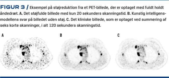 Patienter med Hodgkinslymfom behandles ofte med stråleterapi under fuldt åndedrætshold, hvorved den øgede luftmængde i lungerne bidrager til at spare kritisk væv (lunger, hjerte og kar) for ekstra stråling [19], samtidig med at tumorvæv ikke bliver påvirket af åndedrætsbevægelser. Patienterne PET/CT-skannes normalt mange gange med holdt monitoreret åndedræt, men med AI-teknikken, der er udviklet som et masterprojekt fra DTU og KU af civilingeniør Mathias Gæde [20], kan proceduren reduceres til en enkelt skanning a 20 sekunders varighed (Figur 3).