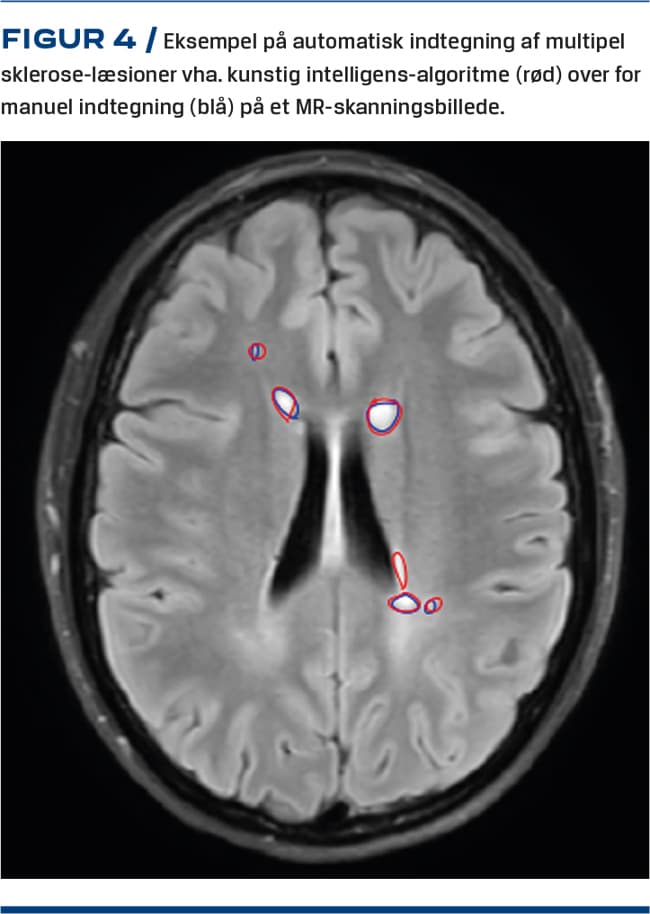 AI som beslutningsstøtte ved klinisk billeddiagnostik er under udvikling mange steder til brug ved mammografi, røntgenoptagelser af thorax samt muskel-og skeletundersøgelser i et stort EU-projekt ledet fra Bispebjerg Hospital. MR-skanning anvendes til udredning og monitorering af multipel sklerose, der manifesterer sig som små hvide læsioner på MR-skanningsbilleder. Antal og volumen af læsioner på MR-skanningsbillederne er centralt for monitorering af patienterne, som følges over år med gentagne skanninger, og man indtegner ofte disse læsioner på billederne – et arbejde, som er langsommeligt og omstændeligt. Mange arbejder med AI til automatisk løsning af denne opgave, men en metode er endnu ikke indført klinisk. Ved den internationale konference Challenge MICCAI 2017 søgte man at lave den bedst mulige algoritme til indtegning af disse læsioner på et kendt dataset [22]. Vi valgte den vindende algoritme [23], og i et masterprojekt fra DTU og KU har civilingeniør Amalie Hindsholm udviklet AI til at matche speciallægers indtegninger [24] (Figur 4). Efter en prospektiv evaluering er målet at indføre metoden som rutine.