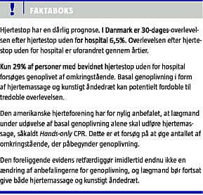 Hjertestop har en dårlig prognose. I Danmark er 30-dagesoverlevelsen efter hjertestop uden for hospital 6,5%. Kun 29% af personer med bevidnet hjertestop uden for hospital forsøges genoplivet af omkringstående [1]. Dette er analogt til internationale forhold. Overlevelsen efter hjertestop uden for hospital er uforandret gennem årtier [2]. Basal genoplivning i form af hjertemassage og kunstigt åndedræt kan potentielt fordoble til tredoble overlevelsen [3]. Den Amerikanske Hjerteforening har for nylig anbefalet, at lægmand under udøvelse af basal genoplivning alene skal udføre hjertemassage, såkaldt Hands-only CPR, og kun i særlige situationer give kunstigt åndedræt [4]. Hovedargumenterne for hjertemassage alene er den lille andel af de omkringstående der yder basal genoplivning ved hjertestop samt et ønske om at forenkle genoplivningsproceduren.