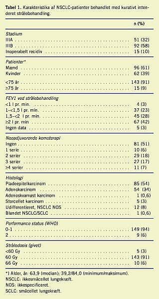 Materia le og metoder : I perioden fra 1995 til 2003 blev 158 patienter med inoperabel, ikkesmåcellet lungekræft stadium III behandlet med kurativt anlagt strålebehandling med doser fra 60 til 66 Gy på 30 til 33 fraktioner. Neoadjuverende kemoterapi blev givet til 77 patienter.