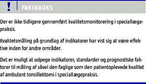 Summary Quality of outpatient tonsillectomy performed in ear, nose & throat practice Ugeskr Læger 2010;172(28):2049-2054 In Danish healthcare there are increasing demands in the field of hospital care on performance and outcome measurement and quality improvement in relation to a number of diseases. Hitherto, corresponding measurements of quality have not been carried out among private specialized practitioners. The present project describes the development and selection of evidence-based national indicators, standards, and case mix factors in terms of prognostic factors with the purpose of measuring quality of out-patient tonsillectomy in Danish ear, nose & throat practices.