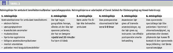 Ambulant tonsillektomi i speciallægepraksis er i nærværende studie defineret som elektiv tonsillektomi/adenotonsillektomi, hvor såvel forundersøgelse, inklusive information, og det kirurgiske indgreb udføres i praksis. Patienten hjemsendes efter opvågningsperioden i den pågældende praksis og aflægges et besøg senere samme dag af den opererende speciallæge. Det anbefales, at speciallægerne følger de af DSOHH udarbejdede retningslinjer for ambulant tonsillektomi (Tabel 2).