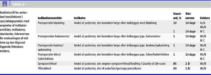 De udpegede kvalitetsmål fremgår af Tabel 3 . Initialt er indikatorområderne defineret som postoperativ blødning, postoperative halssmerter, postoperativ kvalme/opkastning, postoperativ halsinfektion/febrilia, symptomfrihed og patientoplevet tilfredshed. De tilhørende indikatorer til måling af kvaliteten af hvert indikatorområde er herefter opstillet. Ud fra de klassificerede videnskabelige undersøgelser er der fastlagt standarder, hvilket anskueliggør de realistiske/opnåelige kvalitetsmål. Desuden anføres tidsrammen for evalueringen af den pågældende indikator samt evidensen af den tilgrundliggende litteratur.