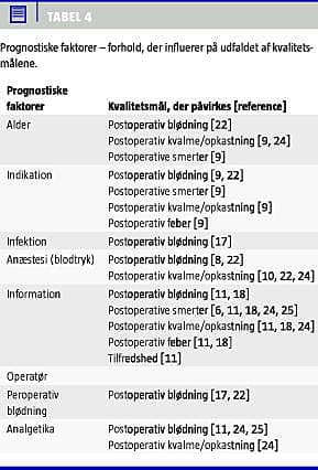 Mortalitetsraterne ligger internationalt mellem 1:150.00 og 1:50.000 [3]. Ifølge litteraturen indlægges/genindlægges 0-30% af tonsillektomerede patienter [6, 8, 9, 11, 13, 15, 16]. Specielt rapporteres indlæggelsesfrekvensen af planlagt ambulant opererede til 4-30% [6, 8, 11, 13]. Disse drejer sig om ambulante patienter i hospitalsregi, mens tilsvarende opgørelser ikke er tilgængelige for speciallægepraksis. Endvidere er der foretaget opgørelser over tonsillektomerede patienters kontakter til sundhedsvæsenet ud over de aftalte kontroller bl.a. i Danmark, hvor 47% havde en eller flere hovedsageligt telefoniske kontakter [4]. Generelt er årsagerne til indlæggelserne og de ekstra henvendelser i prioriteret rækkefølge: smerter, kvalme/opkastning, blødning, feber [4-25]. Med hensyn til valg af de i Tabel 3 anførte indikatorer er der således lagt vægt på antal ikke forudsete/aftalte kontakter til læge eller skadestue samt indlæggelser som måleenhed for de hyppigste komplikationer: blødninger, smerter, kvalme/opkastning og feber. Som et overordnet mål for den faglige kvalitet er graden af opnået symptomfrihed i sagens natur interessant, idet dette er det ultimative krav fra patienterne til behandlingen. Der er her valgt antal patienter med symptomfrihed/bedring samt en livskvalitetsscore [9, 10, 26, 27]. Endelig er det ønskeligt med et mål for den patientoplevede kvalitet i forbindelse med hele forløbet vurderet som gentagelse/anbefaling af proceduren [9, 10, 26, 27].