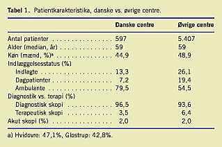 Patientkarakteristika er resumeret i Tabel 1 . Køns- og alderssammensætningen i den danske patientpopulation var sammenlignelig med den på de øvrige centre. Flertallet af kolon-oskopierne på de danske afdelinger gennemførtes ambulant, hvorimod næsten halvdelen af patienterne på de øvrige afdelinger fik undersøgelsen udført under indlæggelse.