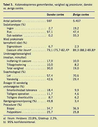 Resultater: Der blev registreret 597 kolonoskopier i Danmark og 5.407 kolonoskopier på de øvrige centre. Patientkarakteristika og indikationer for undersøgelse på de danske centre var sammenlignelige med patientkarakteristika og indikationer for undersøgelse på de øvrige centre. Udrensningen på de danske centre var tilfredsstillende i 64% af tilfældene mod 76% på de øvrige centre. De danske læger havde en lavere succesrate (79% vs. 89%) og var længere tid om at nå til caecum (17 min vs. 10 min), end man var på de øvrige centre. Røntgengennemlysning anvendtes ved 50% af kolonoskopierne på de danske centre og ved kun 3,4% på de øvrige centre.