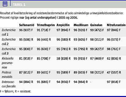 Kvalitetssikring af mikrobiologiske undersøgelser i almen praksis er forholdsvis ny, og i Danmark har der også været forskellige holdninger til, om kvaliteten af resistensbestemmelse i lægehuse er god nok. I andre lande foretages resistensbestemmelse endnu ikke i primærsektoren. Der er derfor ingen erfaringer at trække på fra udlandet, og der findes kun få tidligere publikationer fra Danmark [2, 3]. Regionernes incitament til kvalitetssikring af behandling af urinvejsinfektioner (UVI) er naturligvis en forventning om, at gode kvalitetssikringsresultater også afspejler gode patientbehandlingsresultater. Teoretisk burde der være lige mange svar for alle antibiotika for f.eks. Escherichia coli 1 , men der er 937 for sulfonamid og 472 for quinolon. Forskellen skyldes, at lægepraksis i Danmark anvender forskellige resistensbestemmelsessystemer, f.eks. anvender brugere af Sensicult (dyrkningsmetode til bedømmelse af urinvejsbakteriernes følsomhed over for de antibiotika, der normalt anvendes til behandling af UVI) ofte fire forskellige antibiotika, mens brugere af agarplader ofte, men ikke altid anvender seks antibiotika. Nogle fravælger quinolon eller nitrofurantoin, fordi de ikke bruger det i behandling af UVI. Et antibiotikum kan også være udskiftet med et andet i perioden.