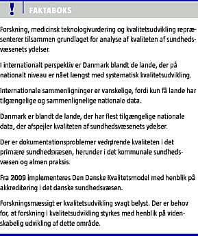 I internationalt perspektiv er Danmark blandt de lande, der er nået længst med systematisk kvalitetsudvikling. Danmark er formentlig det land internationalt, hvor der er iværksat flest nationale initiativer, og et af de lande, der har det største omfang af aktuelle data vedrørende kvaliteten af sundhedsvæsenets ydelser, som er tilgængelige via offentlige hjemmesider, eksempelvis sundhed.dk og sundhedskvalitet.dk.