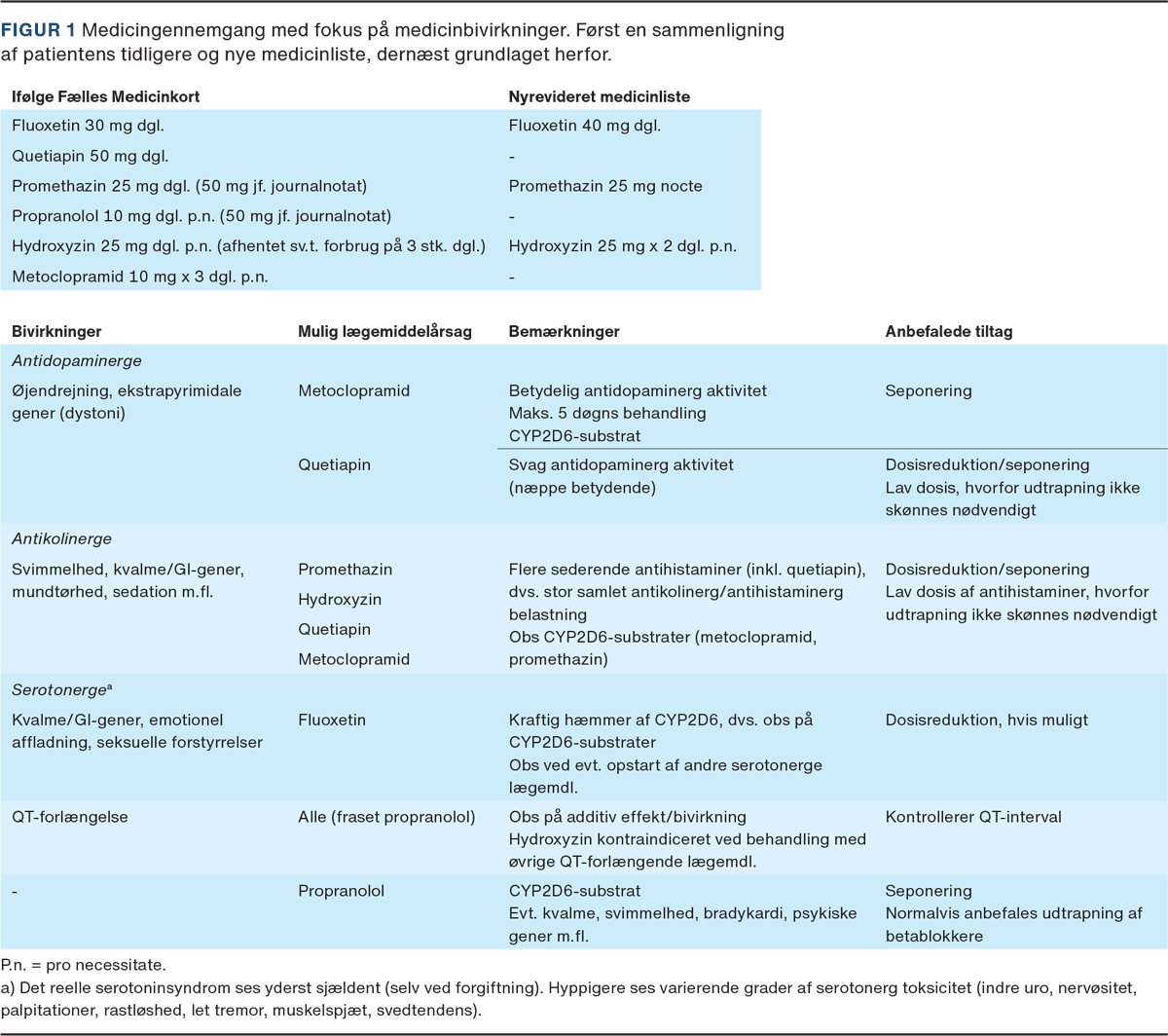 En 22-årig kvinde med svær psykiatrisk sygdom var i forløb i et specialiseret ambulatorium for patienter med psykisk lidelse og rusmiddelmisbrug. Hun var diagnosticeret med svær angst, depression, emotionel ustabil personlighedsstruktur, PTSD, cannabisafhængighedssyndrom og med nogle symptomer på OCD og spiseforstyrrelse (BMI 19 kg/m²). Desuden havde patienten sporadisk indtag af illegale benzodiazepiner og kokain, og der var mistanke om ADHD. Patienten havde gennem livet været plaget af kvalme, med forværring siden gymnasietiden og lindring ved hashrygning. P.t. havde patienten daglige opkastninger og tendens til svimmelhed. Objektivt var hun vågen, klar og orienteret. Der var ingen psykotiske symptomer eller suicidalrisiko. Blodprøver (inkl. test for P-kalium), puls og blodtryk var upåfaldende og EKG’et normalt (QTc 431 ms). Der var en del uoverensstemmelse mellem patientens ordinationer og det faktiske indtag (Figur 1). F.eks. havde hun øget promethazin fra 25 mg til 75 mg dagligt, men fortrød på grund af udtalt sløvhed. Undervejs i forløbet berettede patienten om episoder med ufrivillig øjendrejning af ca. tre timers varighed uden kendte provokerende faktorer. Den behandlende læge kontaktede MedicinInfo med henblik på medicingennemgang med fokus på medicinbivirkninger – særligt dystoni (okulogyr krise), kvalme og QT-forlængelse.