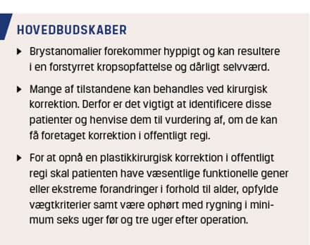 Formålet med denne artikel er at gennemgå de hyppigst forekommende brystanomalier og behandlingsmuligheder, således at disse patienter bedst muligt kan identificeres og henvises til vurdering af mulighed for korrektion i offentlig regi.