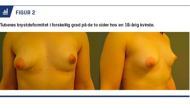 Tuberøs brystdeformitet, der kan forekomme uni- eller bilateralt, er karakteriseret ved et smalt »tubeformet« bryst med underudviklet nedre pol og et overdimensioneret, frembulende AP-kompleks. Tuberøs brystdeformitet er en medfødt tilstand med ukendt ætiologi. En teori er, at det skyldes en fortykkelse og konstriktion i den superficielle fascie ved brystets basis, hvilket forhindrer normal radiær vækst/ekspansion af brystvævet. Begrænsningen i den radiære ekspansion af brystvævet resulterer i herniering af brystvævet gennem areola [21, 22] (Figur 2).