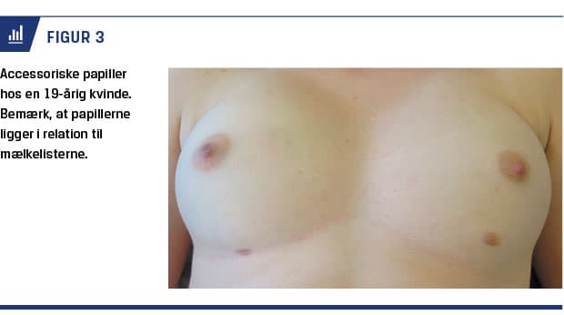 Accessoriske papiller, har den samme incidens, 1-5%, hos mænd og kvinder. Incidensen varierer afhængigt af etnisk baggrund. Accessoriske papiller kan være unilaterale eller bilaterale og er hyppigst lokaliseret i inframammærfuren [23] (Figur 3). De samme sygdomme, som kan forekomme i en normal papil, kan også forekomme i en accessorisk papil.
