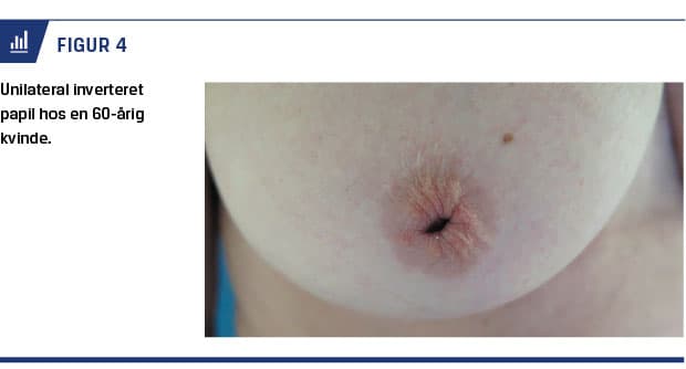 Inverterede papiller har en incidens på ca. 2%. Tilstanden kan være erhvervet eller medfødt, og ved den kongenitte tilstand er yderligere udredning ikke indiceret, mens der skal udredes for eventuel underliggende malignitet ved den erhvervede tilstand. Abnormiteten skyldes forkortelse af mælkegange og dannelse af fibrøse strøg under papillen [25] (Figur 4). En del kvinder kan opleve problemer og ubehag ved amning, men de fleste ammer uden problemer. Der kan forekomme fugt- og lugtgener fra papillen [25-26].
