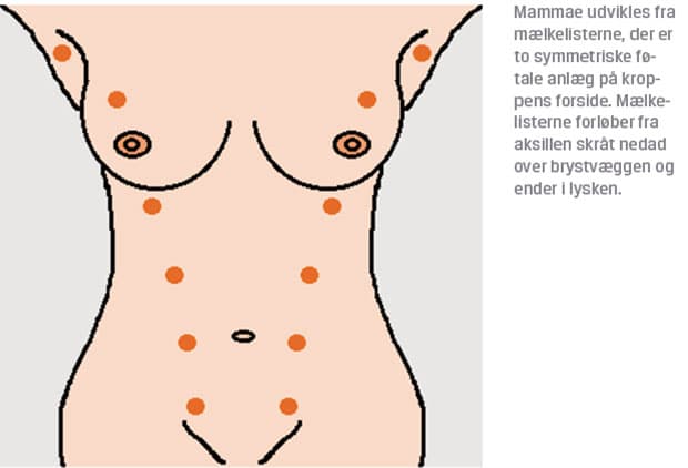 Mammae udvikles fra mælkelisterne, der er to symmetriske, føtale anlæg på kroppens forside og forløber fra aksillen skråt nedad over brystvæggen og abdomen til lysken. Mælkelisterne regredierer normalt under fosterudviklingen undtagen på lokalisationen for de normale mammae. Langs mælkelisterne kan der forekomme overtallige papiller eller accessorisk brystvæv [3]. Brystudviklingen, der klinisk klassificeres efter Tanners stadieindeling, begynder hos piger almindeligvis i 8-13-årsalderen, og mammae når deres endelige størrelse i slutningen af puberteten [4].