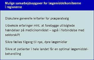 I danske undersøgelser er det påvist, at en del fejl i patienters medicinering opstår ved sektorskift [1, 2] (når patienter indlægges og udskrives fra sygehus), og udarbejdelse af en fælles regional eller national- rekommandationsliste for de to sektorer synes således at være rationel. Dette arbejde er initieret i form af den nationale rekommandationsliste i regi af Institut for Rationel Farmakoterapi, og forventes afsluttet primo 2007. Den nationale rekommandationsliste har til formål at støtte lægers ordination, hvad angår valget af tilgængelige, analoge præparater, vurderet på effekt og sikkerhed og vel at mærke ikke på pris.