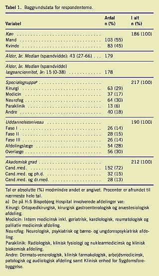 I alt 225 (60%) af de 376 spørgeskemaer blev returneret i helt eller delvist udfyldt stand. Respondenterne var repræsentative for hospitalets samlede lægestand, og deres baggrundsdata er opsummeret i Tabel 1 .
