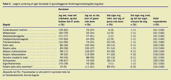 Forståelse af forskningsmetodologiske begreber er en forudsætning for korrekt praktisering af evidensbaseret medicin (EBM). Formålet var at undersøge lægers fortrolighed med EBM-relaterede begreber og sammenholde denne fortrolighed med brugen af informationskilder, kritisk læsning af videnskabelig litteratur samt anvendelse af EBM i praksis.Et spørgeskema blev udsendt til alle læger (n=376) på H:S Bispebjerg Hospital, og en fortrolighedsscore for de EBM-relaterede begreber blev sammenfattet. Lægerne skulle også tage stilling til et dummy -begreb. De blev herefter udspurgt om brug af forskellige informationskilder, kritisk læsning af videnskabelig litteratur og praktisering af EBM. Disse forhold blev sammenholdt med niveauet af fortrolighed med begreberne. Endvidere blev hyppige brugere af Cochrane-biblioteket sammenlignet med resten. Responsraten var 60% (n=225), men repræsentativ for hospitalets lægestab. Ti læger (4%) mente at kunne definere og forklare alle 12 EBM-begreber. Over halvdelen af alle læger tilkendegav at kende til dummy -begrebet. Flertallet udtrykte interesse for at vide mere om begreberne. Cochrane-biblioteket var den informationskilde, der blev benyttet mindst, og 49% af lægerne havde aldrig benyttet det. Brugere af Cochrane-biblioteket havde større forskningserfaring og fortrolighed med begreberne. De fleste lægers kendskab til EBM-relaterede begreber er forholdsvist begrænset med en tendens til at overvurdere eget kendskab. Læger bør konsultere informationskilder, der er baseret på opdateret evidens frem for traditionelle informationskilder, som hurtigt forældes.