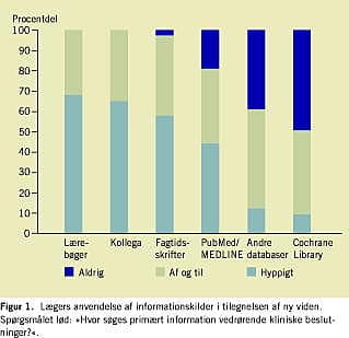 Cochrane-biblioteket indeholder flere opdaterede systematiske oversigter og referencer til randomiserede kontrollerede undersøgelser end nogen anden database i verden. Læger med terapeutiske problemstillinger - den hyppigst forekomne kliniske problemstilling [11] - burde ideelt set konsultere databasen som det første sted. Det ser dog ud til, at der en del vej igen, før Cochrane-biblioteket er indarbejdet som en fast bestanddel af lægens værktøjskasse. Vi fandt, at det var den mindst benyttede informationskilde overhovedet blandt hospitalslæger, og at halvdelen aldrig bruger den. Forklaringer kan være manglende kendskab til anvendelsesmuligheder og betjening samt de elektroniske mediers utilgængelighed i en ofte travl klinisk hverdag. Men også manglende viden om de relevante og hyppigt forekomne begreber, som udgør en hjørnesten i den evidensbaserede litteratur, kan tænkes at spille ind. Mindre kendskab til begreber anvendt i EBM kan påvirke søgemønstre hen imod traditionelle informationskilder, hvor disse begreber ikke optræder med samme hyppighed.