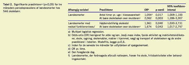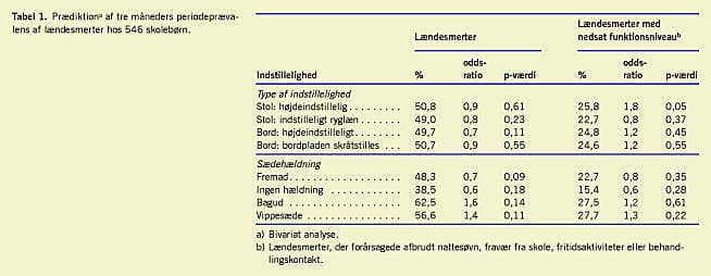 Bivariate analyser viste ingen association mellem sædehældning eller indstillelighed af skolemøblerne og lænderygbesvær (Tabel 1). Bortset fra en borderline- signifikant positiv association mellem at sidde på en højdeindstillelig skolestol og lænderygbesvær med nedsat funktionsniveau var der ingen association mellem indstillelighed af skolemøbler og lænderygbesvær med nedsat funktionsniveau (Tabel 1). Ydermere blev der ikke fundet statistisk signifikant association mellem kropsdimension og dimensioner af skolemøbler og lænderygbesvær. Skolebørnene blev spurgt om, hvorvidt de havde indstillet deres møbler eller ikke. Forekomst af lændeygbesvær var ikke associeret med brug af denne mulighed. Lænderygbesvær var positivt associeret med antal timer om ugen i klasseværelset, OR: 1,04 (p = 0,04). Vægten af skoletasken var ikke associeret med lænderygbesvær, men at bære skoletasken over skulderen var positivt associeret med lænderygbesvær og lænderygbesvær med nedsat funktionsniveau, henholdsvis OR: 2,2 (p < 0,0 01) og OR: 1,8 (p = 0,014).