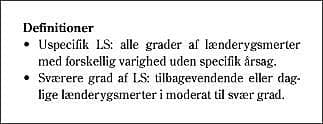 I denne artikel refererer LS til uspecifikke lænderygsmerter uden eksakt diagnose og med smertelokalisation svarende til lænderegion og korsryg.