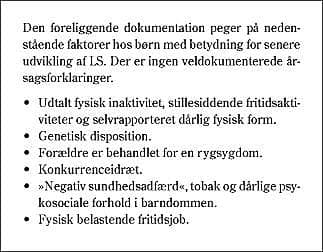LS er almindeligt forekommende hos børn og unge. Med den nuværende viden synes minimal fysisk aktivitet i fritiden, herunder stillesiddende aktiviteter, intensiv sportsudøvelse, familiær arv bl.a. udtrykt ved disposition til diskusdegeneration, psykosociale forhold, rygning og fysisk tungt fritidsarbejde at udgøre risikofaktorer for LS.