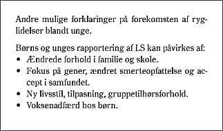 Sværere LS kan anskues ud fra forbruget af sundhedsydelser og ud fra symptomernes indvirkning på det fysiske aktivitetsniveau. Nogle studier viste, at ca. 15% af skoleeleverne med LS havde behov for lægekontakt og behandling (4, 9). Et andet studie viste, at 17% af skoleelever med LS begrænsede omfanget af deres fysiske aktivitet inden for det sidste år pga. rygbesvær (8) (Boks 1 ).