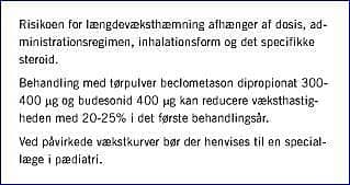 Randomiserede, dobbeltblindede undersøgelser med knemometri har vist, at risikoen for væksthæmning hos børn, der behandles med inhalerede glukokortikoider, afhænger af dosis, administrationsregimen, inhalationsform og det specifikke steroid. Tørpulver beclometason dipropionat 300-400 μ g og budesonid 400 μ g daglig nedsætter højdevæksthastigheden med 20-25% i det første behandlingsår, mens lavere doser af budesonid og fluticason propionat ikke medfører væksthæmning. Data på sluthøjde er vanskelige at tolke bl.a. på grund lav komplians. Børn i behandling med inhalerede steroider bør følges med højdemåling hver sjette måned. Ved påvirket vækst eller ved tvivl om fortolkningen af vækstdata bør der henvises til en speciallæge i pædiatri.